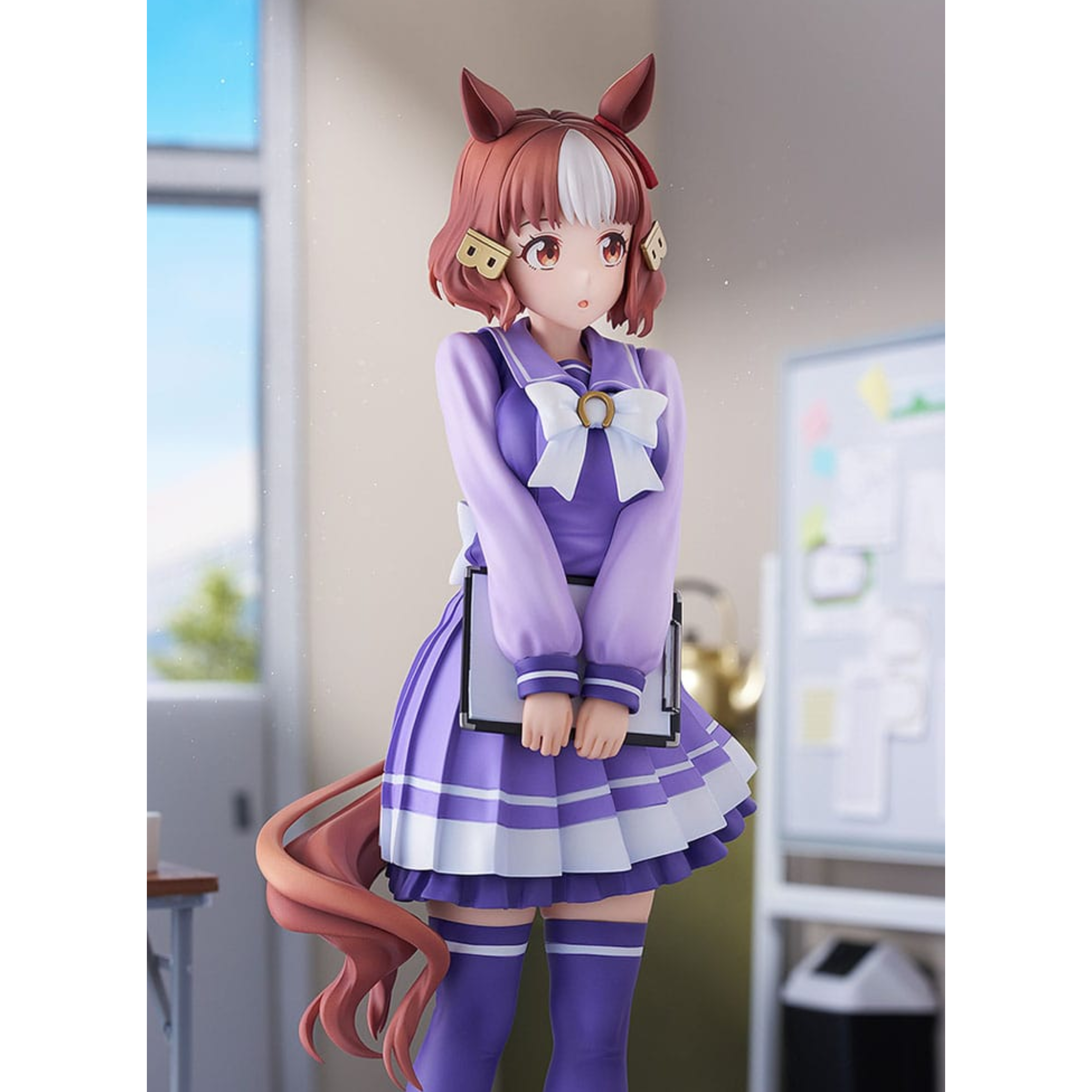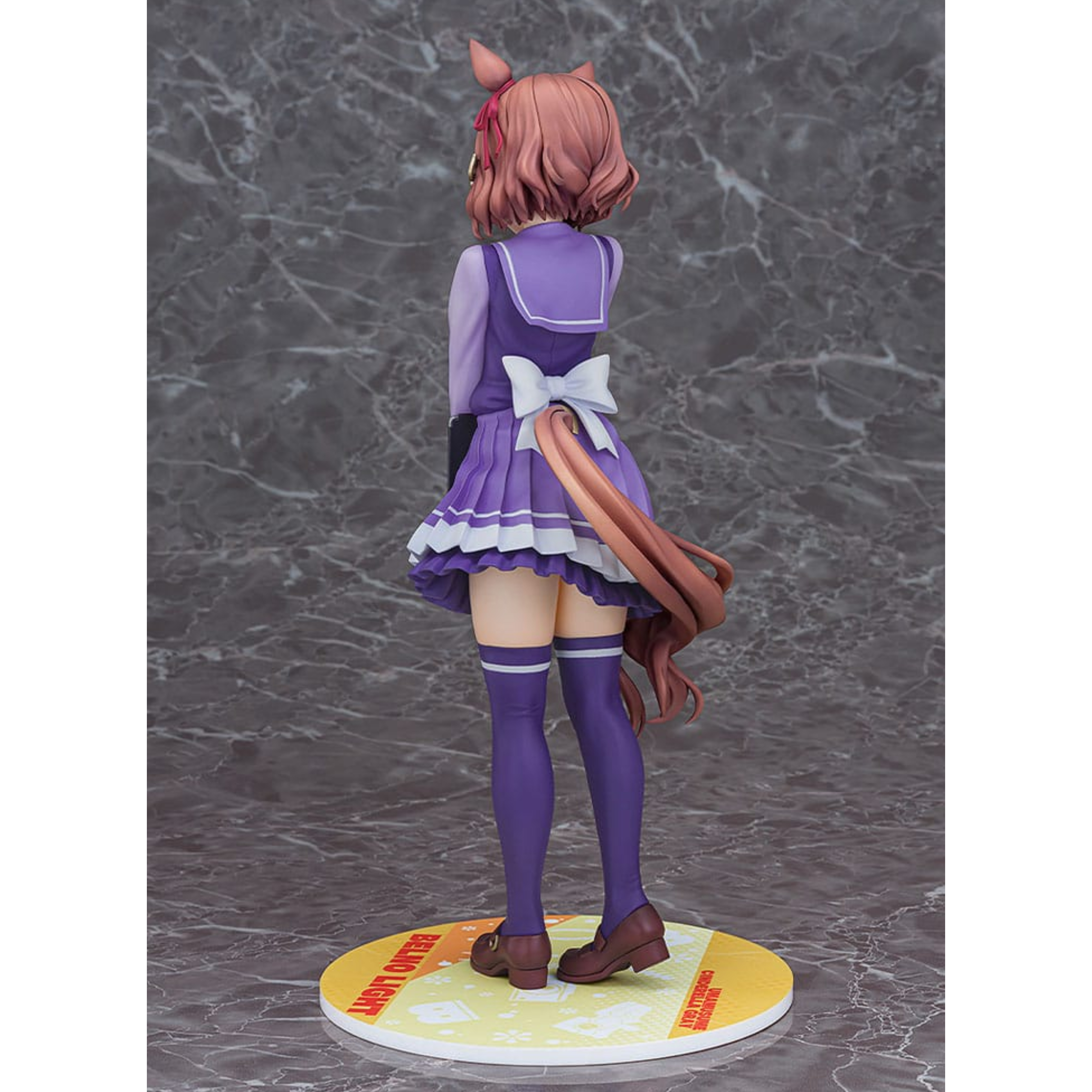 Esta figura la retrata con su uniforme escolar violeta, con un gran lazo blanco en el pecho y una falda plisada con rayas más claras. Unos calcetines a juego hasta los muslos y unos mocasines marrones completan el look. Su cabello castaño con una mecha blanca, peinado con una horquilla y una cinta roja, revela sus orejas de caballo y una cola cuidadosamente esculpida, lo que enfatiza sus orígenes Uma Musume. Sostiene una carpeta gris en sus brazos, lo que refuerza su imagen estudiosa.