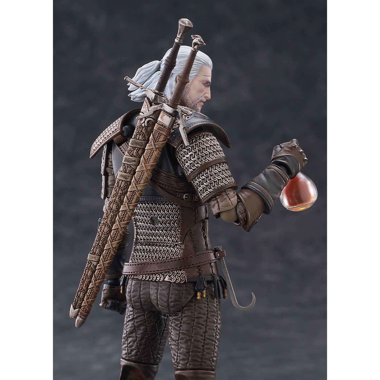 Mide aproximadamente 16 cm e incluye múltiples accesorios: 1x espada de plata, 1x espada de acero, 1x espada de plata Aerondight, 1x espada de acero de Hjalmar, 1x poción, 1x ballesta, 1x mano sosteniendo varias cartas de Gwent, 1x mano realizando la Señal de Igni y 9x manos intercambiables para variar sus poses.