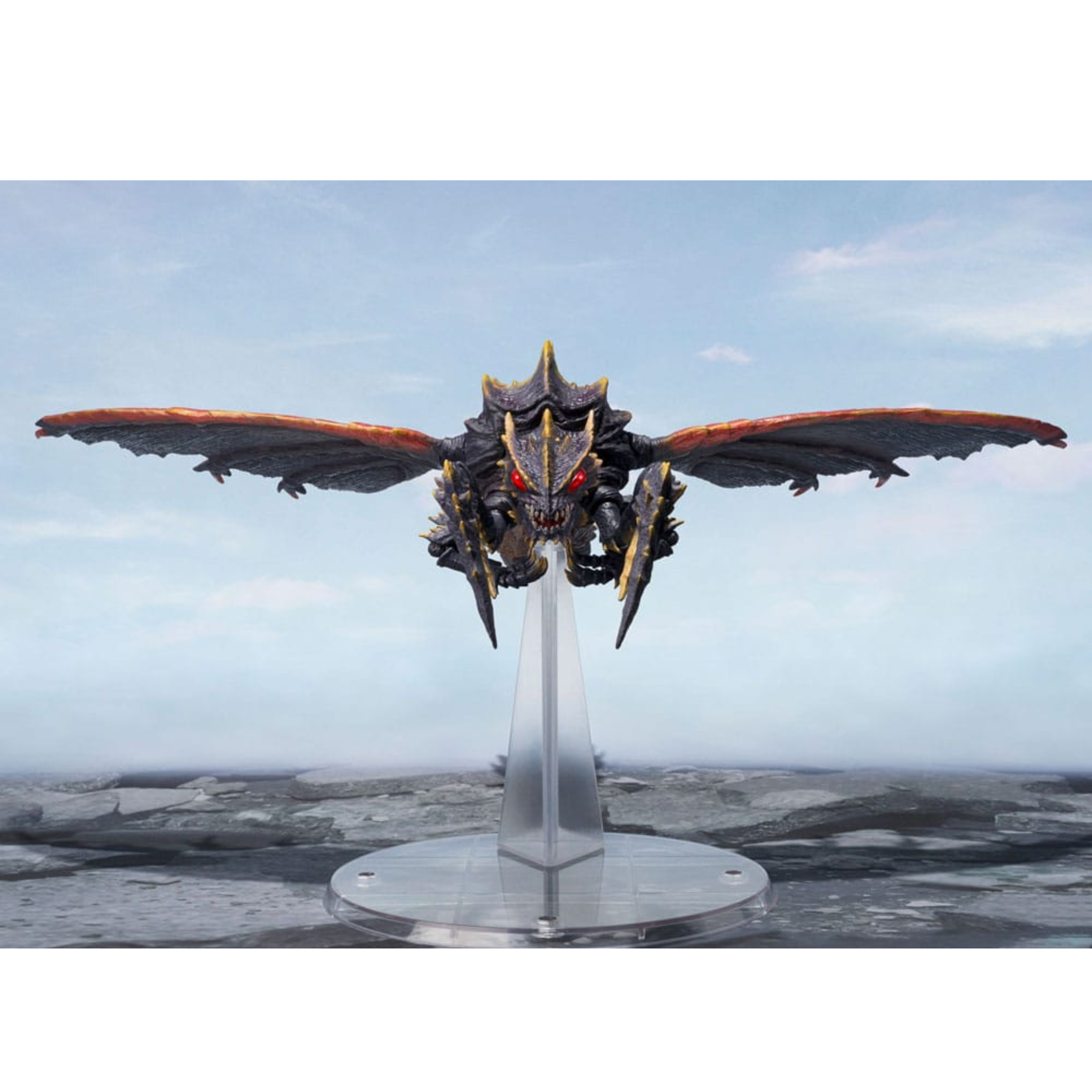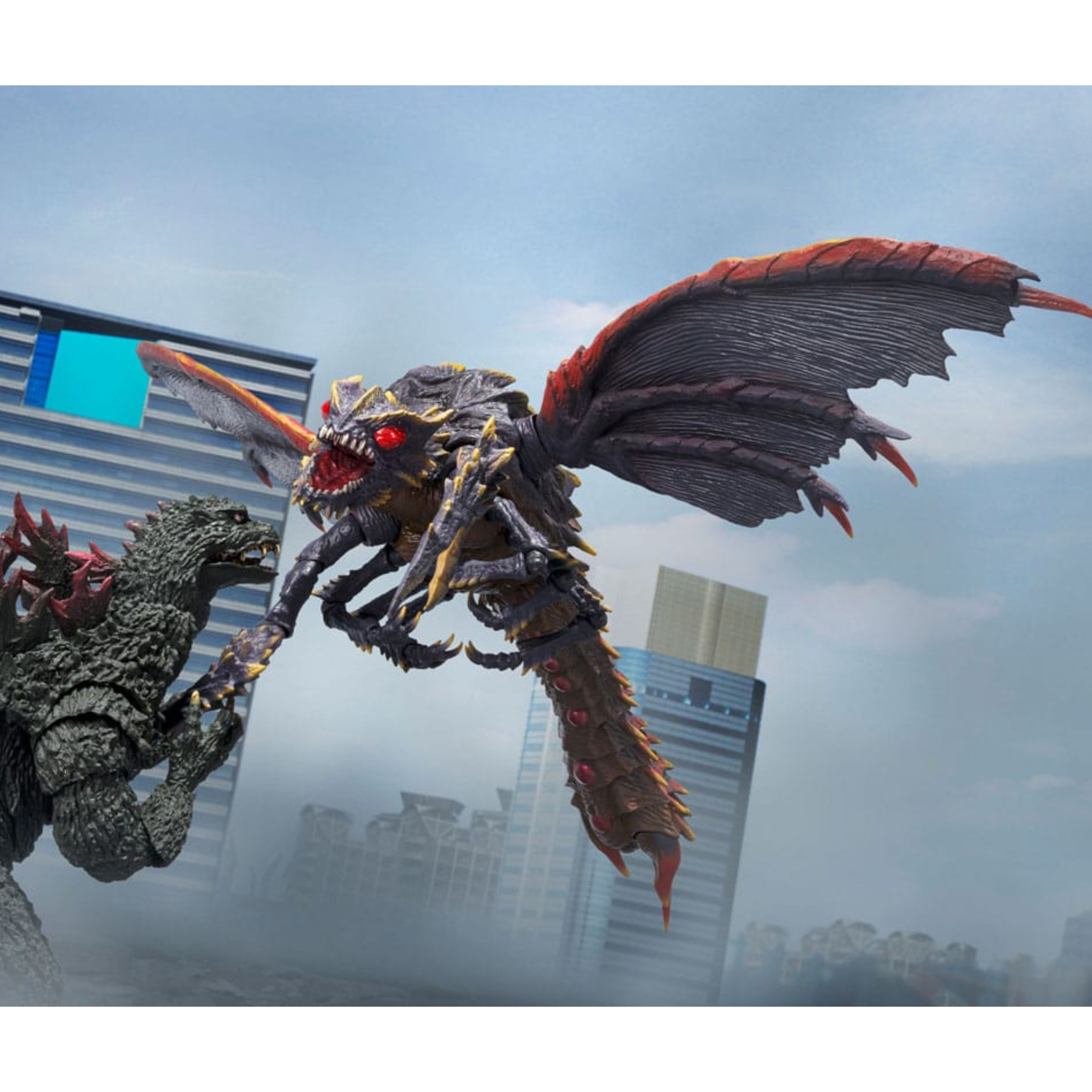 MEGAGUIRUS GODZILLA VS MEGAGUIRUS SH MONSTER ARTS. En el universo de Godzilla, Megaguirus es un temible kaiju nacido de la evolución de Meganulon y Meganula. Este monstruo alado, parecido a un insecto, es rápido y agresivo, y drena la energía de sus enemigos para desatar un poder devastador. Con su diseño insectoide y sus enormes alas, Megaguirus destaca como uno de los enemigos más singulares de Godzilla.