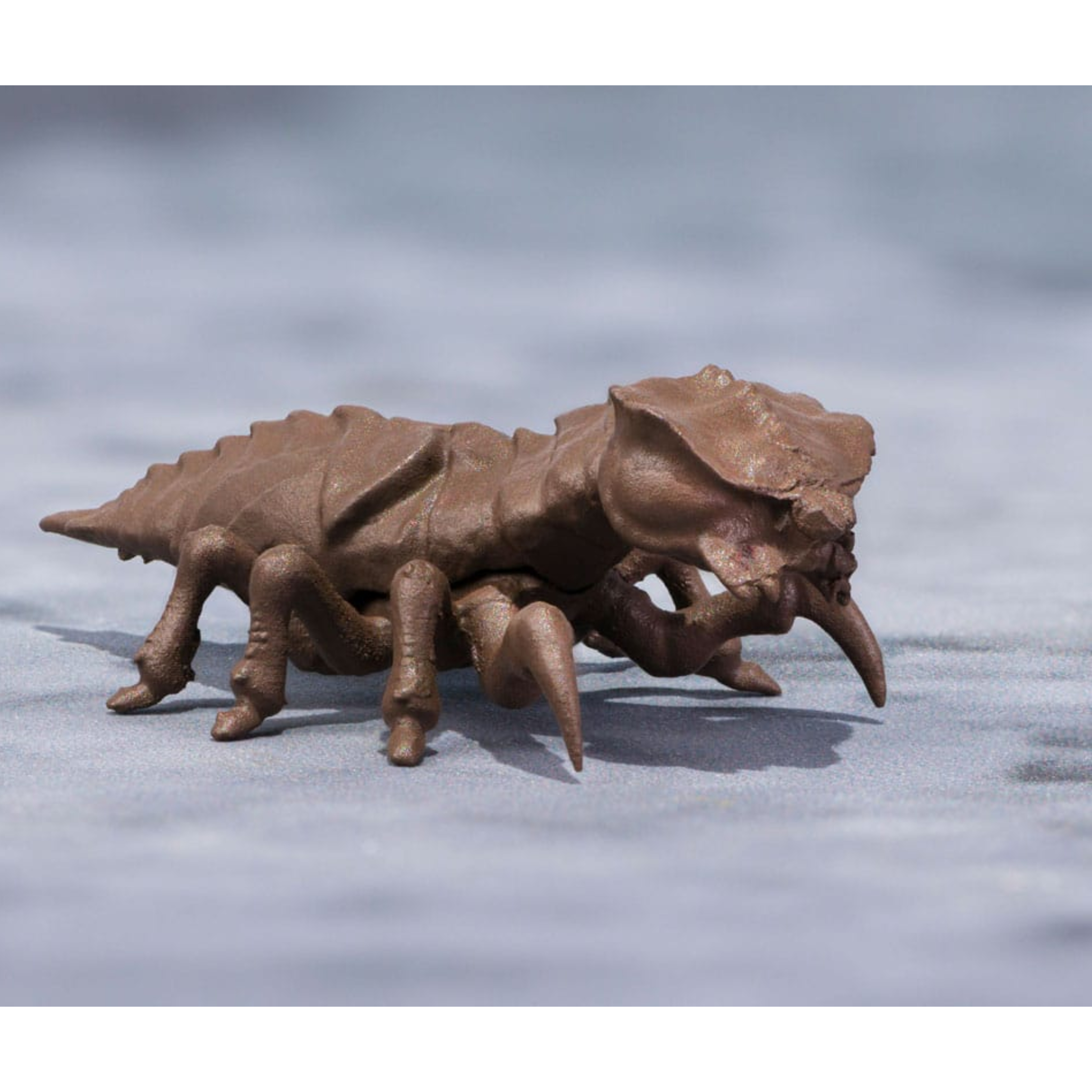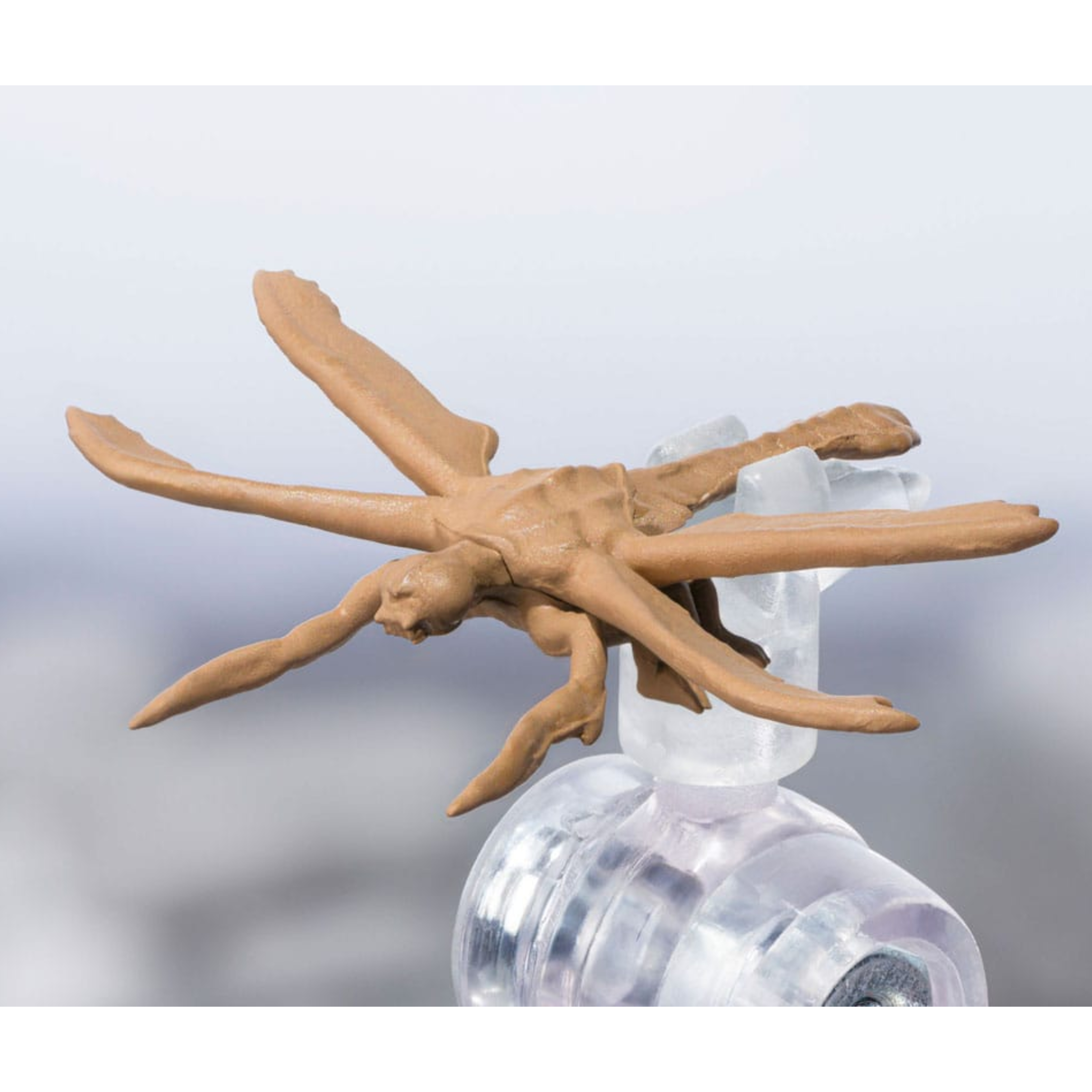 La figura principal de Megaguirus presenta texturas finamente esculpidas, un cuerpo detallado y alas extendidas con llamativos reflejos rojos y negros. Las criaturas más pequeñas están cuidadosamente elaboradas para complementar la exposición, mientras que la base transparente realza la impresión de movimiento aéreo.