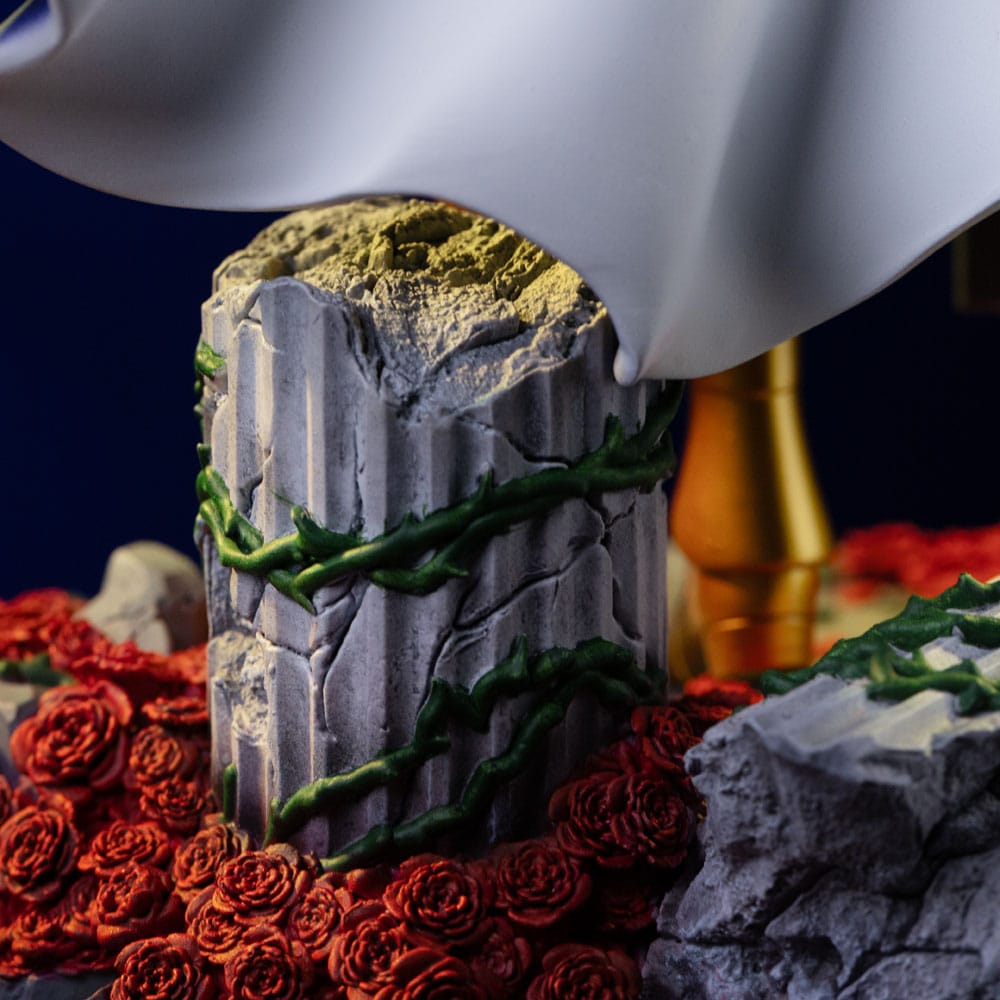 La base representa un suelo de piedra agrietada cubierto de pétalos y rosas rojas, con una columna rota rodeada de hiedra, como un rincón del santuario invadido por la vegetación. El conjunto es estable y se basta por sí solo como pieza central de una estantería de Saint Seiya.