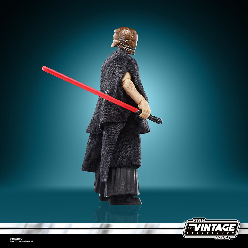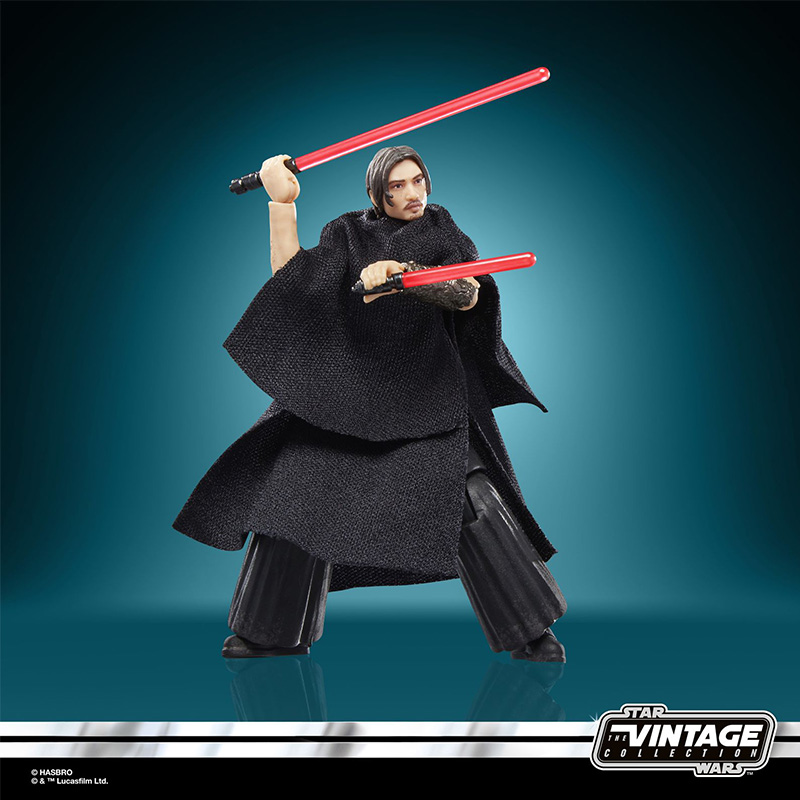 Mide 9,5 cm y presenta un diseño detallado con capa de tela y múltiples puntos de articulación. Incluye 2x sables de luz rojos (de diferente longitud), 1x empuñadura no iluminada, 1x casco intercambiable y 1x túnica de tela. Su embalaje tipo blíster reproduce el estilo clásico de Kenner, con logotipo vintage y numeración para coleccionistas. UNIDADES LIMITADAS.