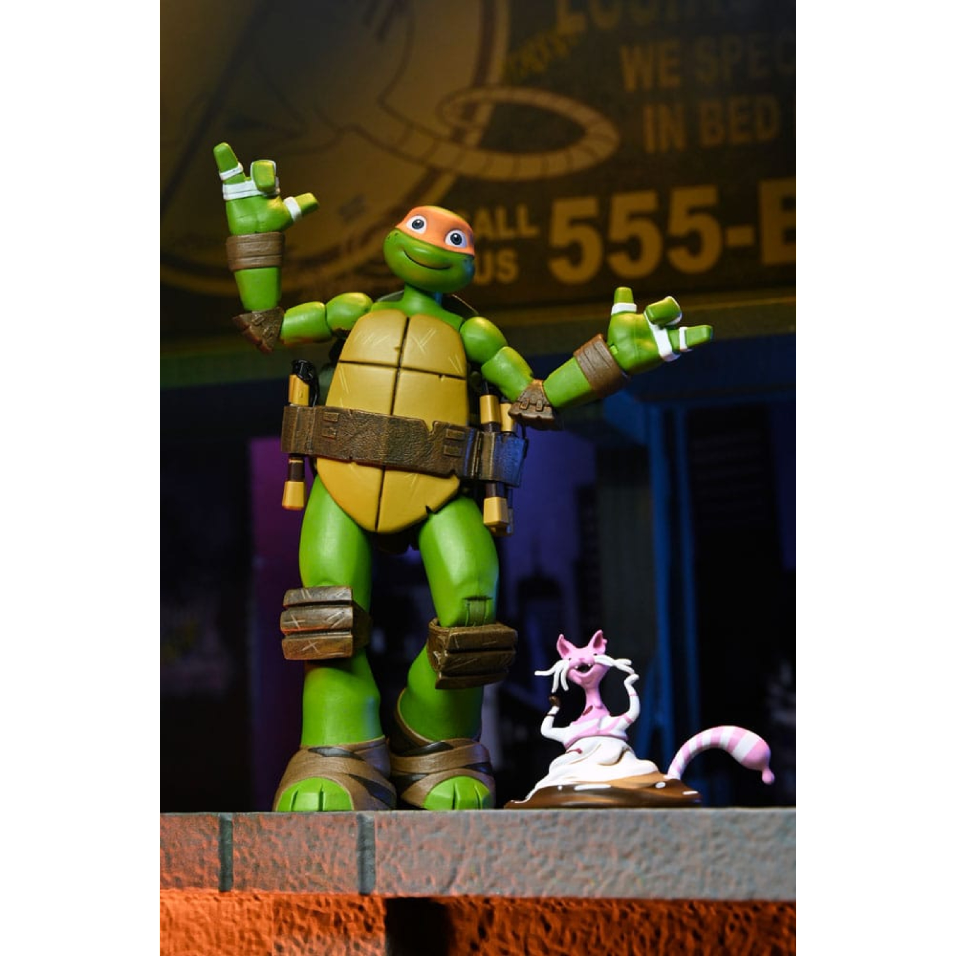 La figura captura a la perfección su diseño de 2012: caparazón beige y marrón, piel verde, máscara naranja y protecciones marrones en brazos y piernas. Cuenta con una cara sonriente y una cabeza alternativa más expresiva. El conjunto de accesorios es muy completo e incluye varios nunchakus (rígidos y con cadena), una hoz, manos intercambiables, un trozo de pizza, una pieza de armadura e incluso Ice Cream Kitty en una versión fiel y llena de encanto.